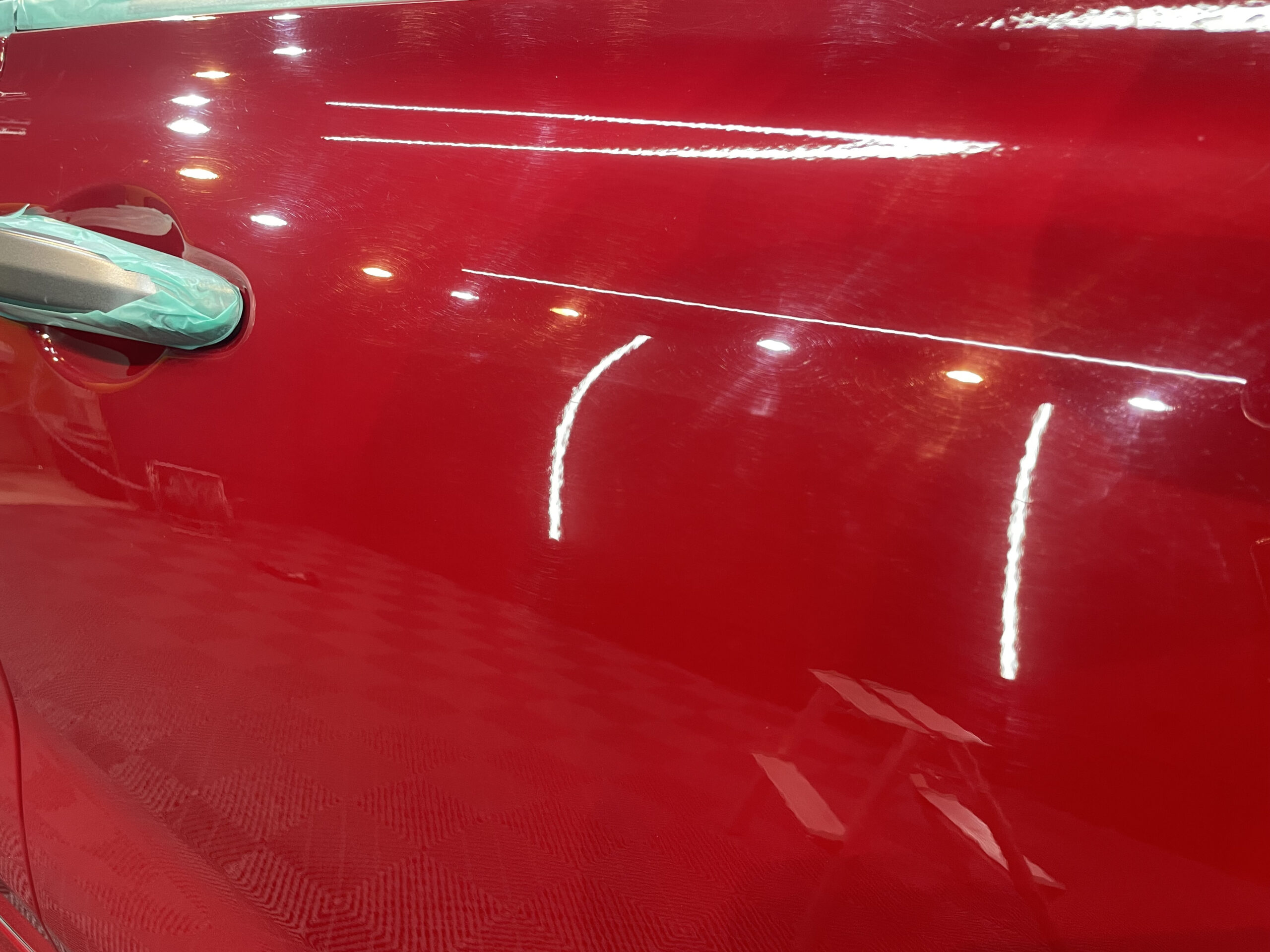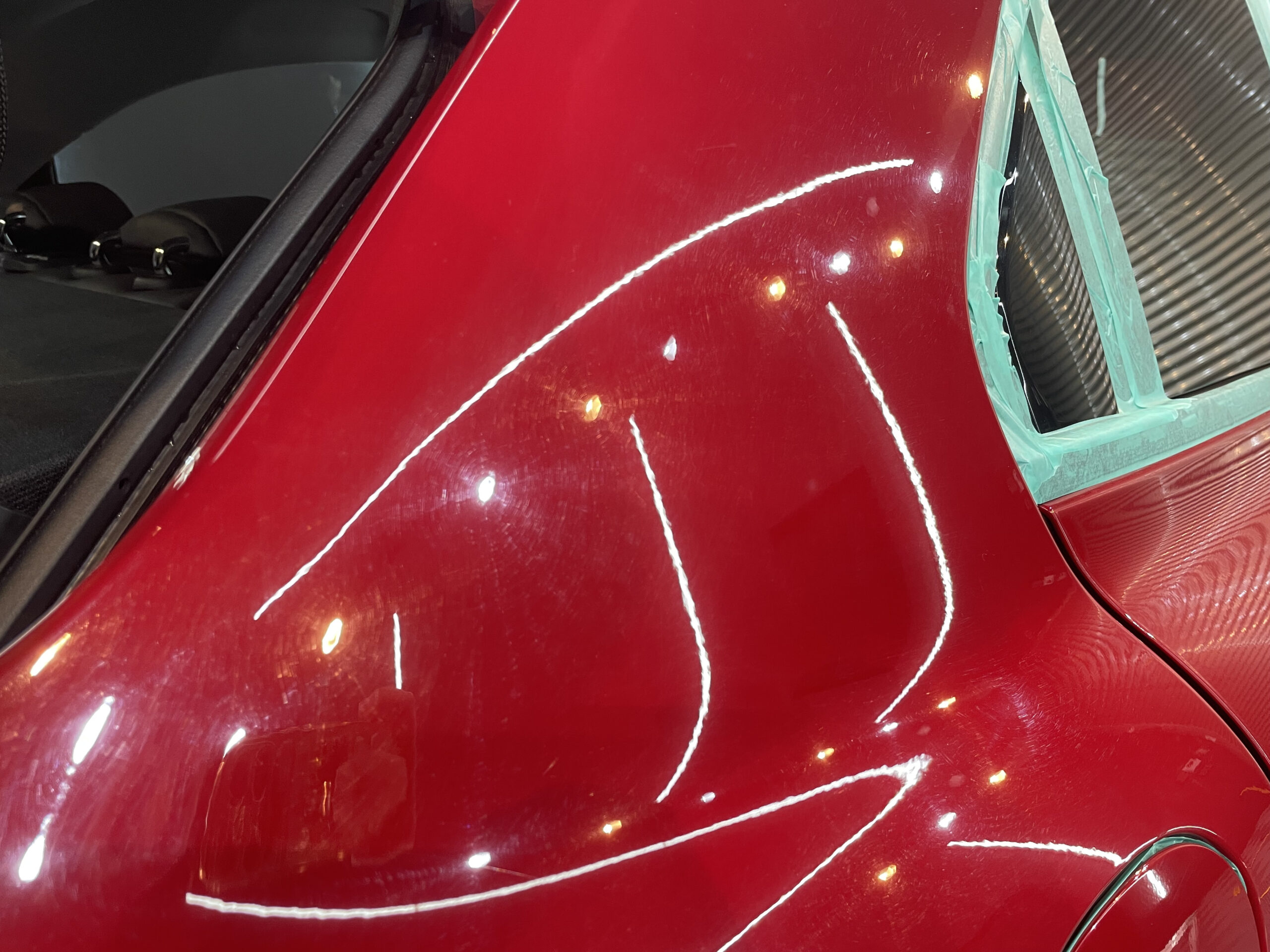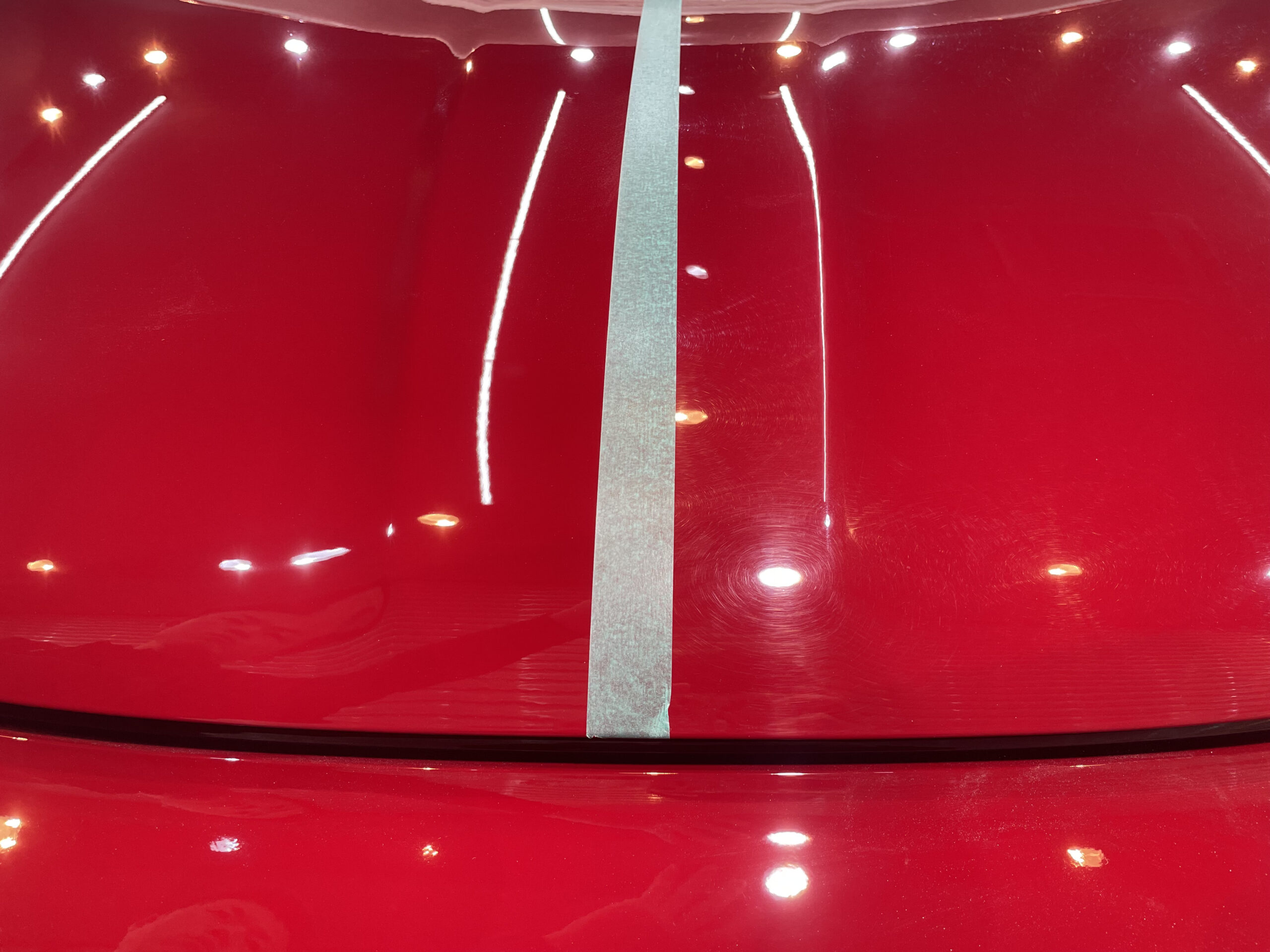 一見すると綺麗に見える状態でも、太陽光や専用照明下では、洗車では除去できない細かなスクラッチが無数に確認できる状態。